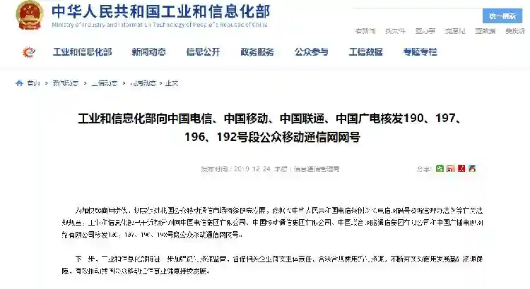 中华人民共和国工业和信息化部网站消息,为加快5G商用步伐,切实促进我国公众移动通信市场持续健康发展,依据《中华人民共和国电信条例》《电信网码号资源管理办法》等有关法规规章,工业和信息化部已于近期分别向中国电信集团有限公司、中国移动通信集团有限公司、中国联合网络通信集团有限公司和中国广播电视网络有限公司核发190、197、196、192号段公众移动通信网网号。